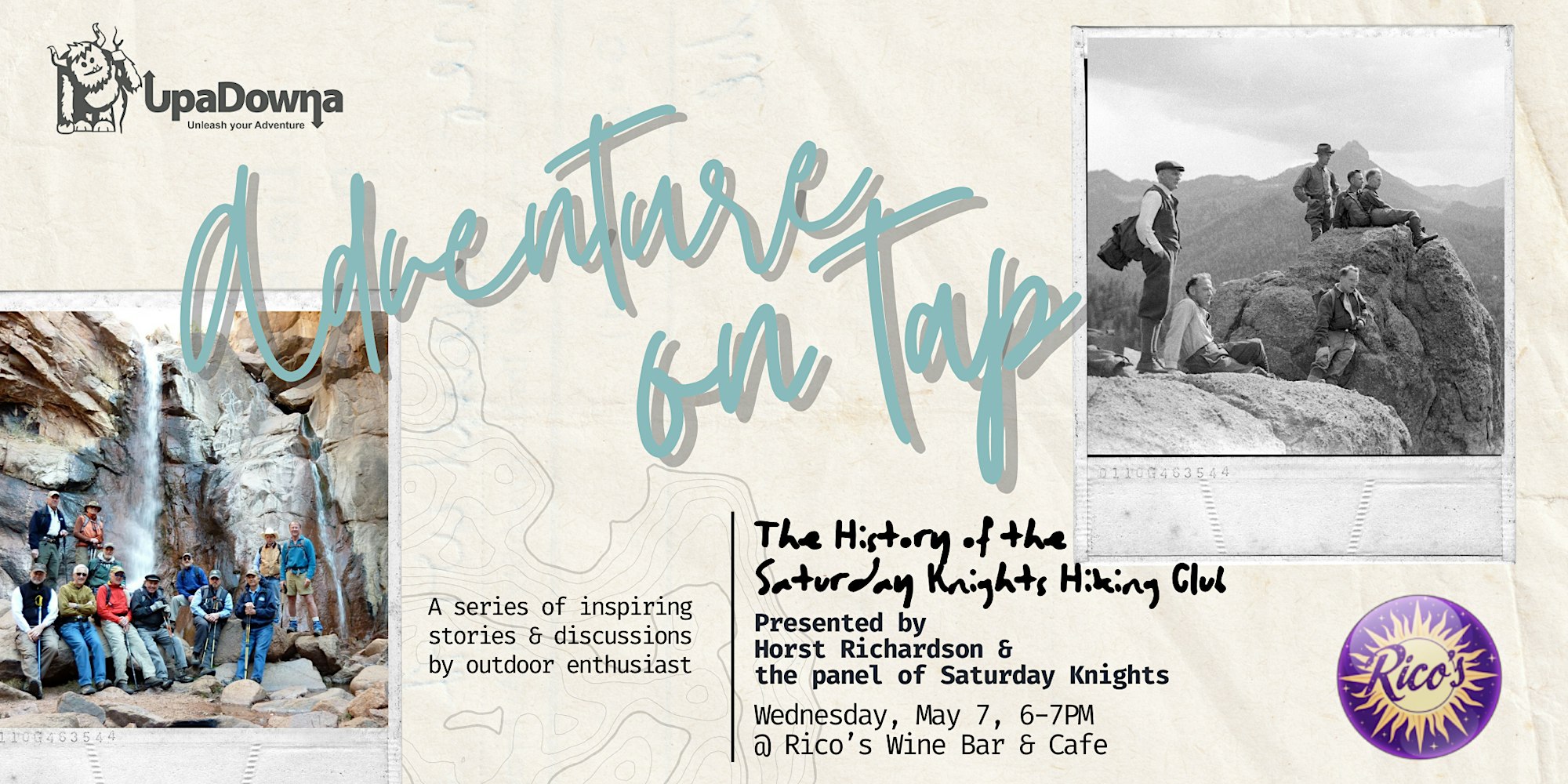 Rico's Cafe & Wine Bar North Tejon Street, Colorado Springs, CO, United StatesJoin UpaDowna for a FREE event and learn about one of the longest standing hiking clubs in the Pikes Peak region, the Saturday Knights!Event Details: Adventure on Tap is a part of UpaDowna's Community Campfire Program. Join us for a casual gathering as our speakers share their stories, passions, and experiences outdoors to inspire you…